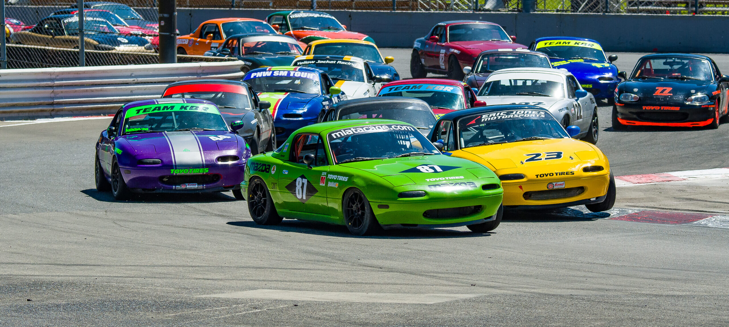Spec Miata is famous for tight battles and finishes that are just inches apart. The competition is intense because no one has more power than anyone else. The difference between cars is mostly in the driver’s ability to hustle around the track.